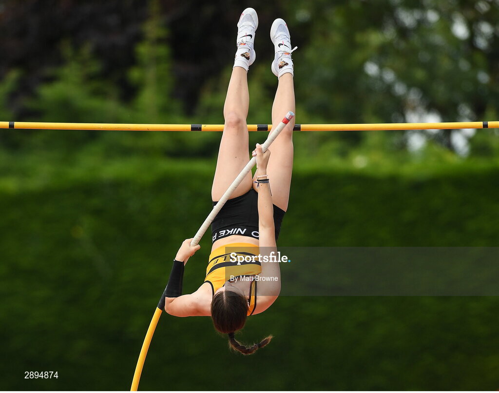 28 July 2024; Una Brice from Leevale AC who finished first in the Premier Women Pole Vault during the 123.ie National Track and Field League Final at Tullamore Harriers Athletics Club in Offaly. Photo by Matt Browne/Sportsfile