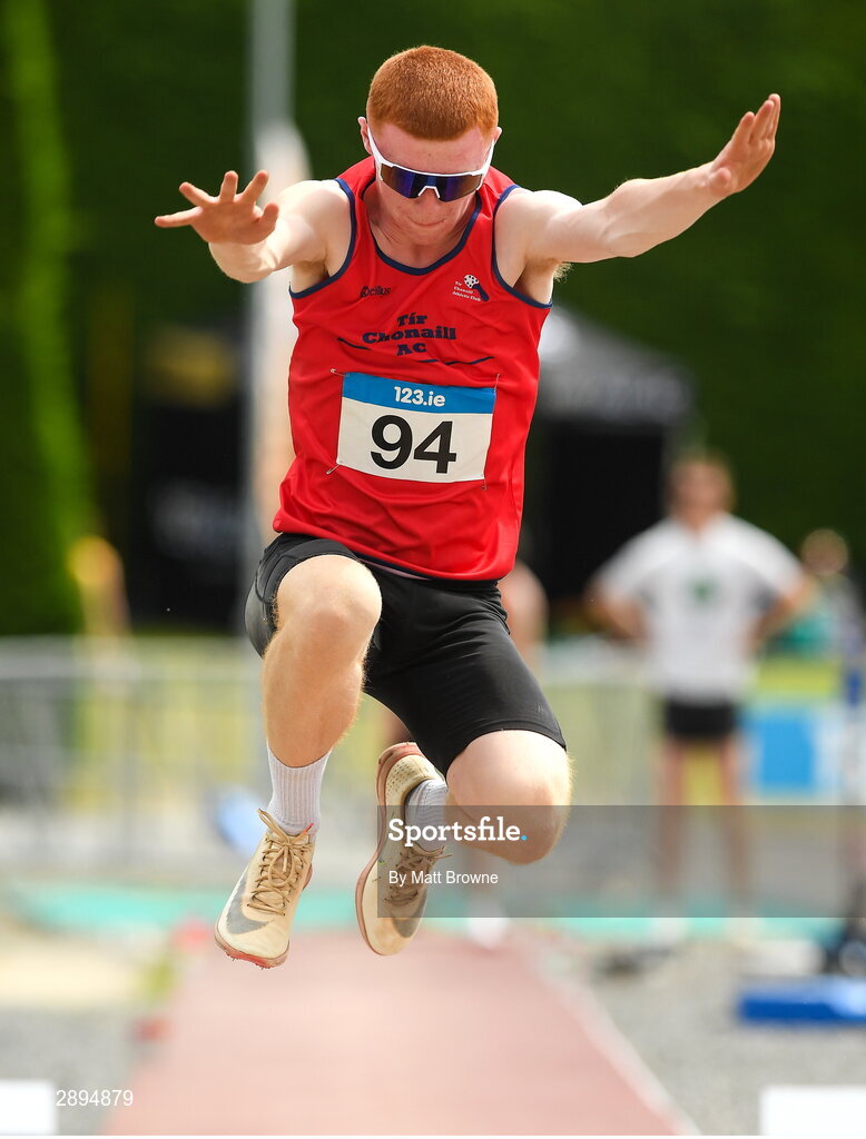 28 July 2024; Jamie Kennedy from Tir Chonaill AC competes in the Premier Men Triple Jump during the 123.ie National Track and Field League Final at Tullamore Harriers Athletics Club in Offaly. Photo by Matt Browne/Sportsfile