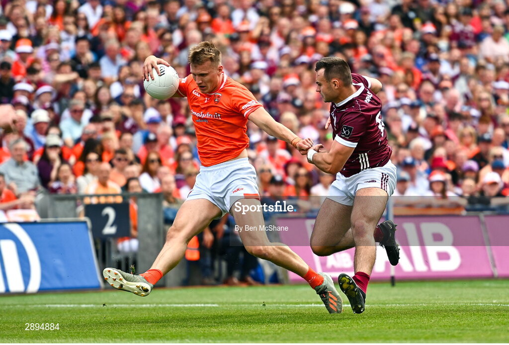 28 July 2024; Rian O'Neill of Armagh in action against Cillian McDaid of Galway during the GAA Football All-Ireland Senior Championship Final match between Armagh and Galway at Croke Park in Dublin. Photo by Ben McShane/Sportsfile
