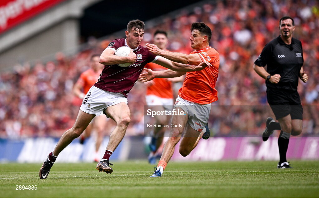 28 July 2024; Matthew Tierney of Galway is tackled by Niall Grimley of Armagh during the GAA Football All-Ireland Senior Championship Final match between Armagh and Galway at Croke Park in Dublin. Photo by Ramsey Cardy/Sportsfile