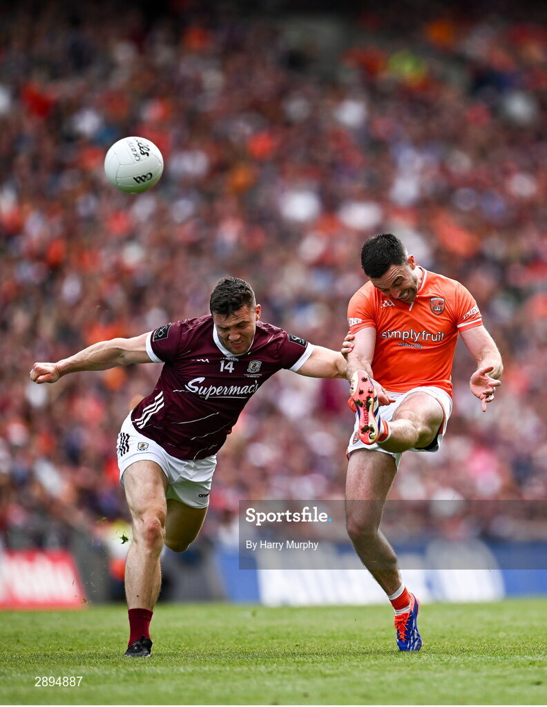 28 July 2024; Aidan Forker of Armagh kicks a point despite the attention of Damien Comer of Galway during the GAA Football All-Ireland Senior Championship Final match between Armagh and Galway at Croke Park in Dublin. Photo by Harry Murphy/Sportsfile