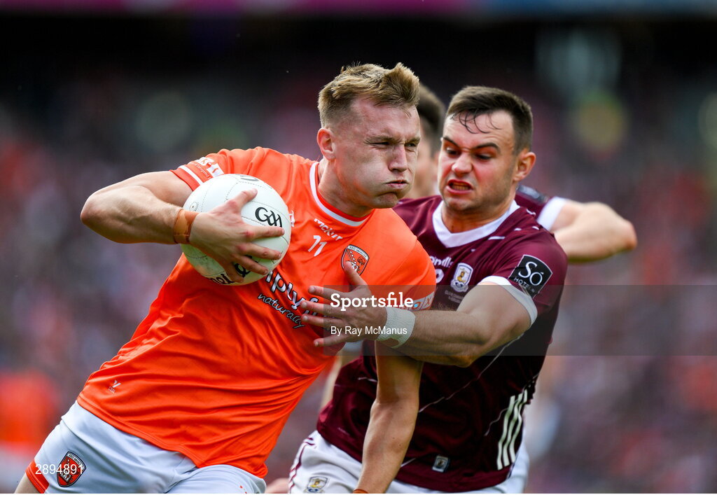 28 July 2024; Rian O'Neill of Armagh is tackled by Cillian McDaid of Galway during the GAA Football All-Ireland Senior Championship Final match between Armagh and Galway at Croke Park in Dublin. Photo by Ray McManus/Sportsfile