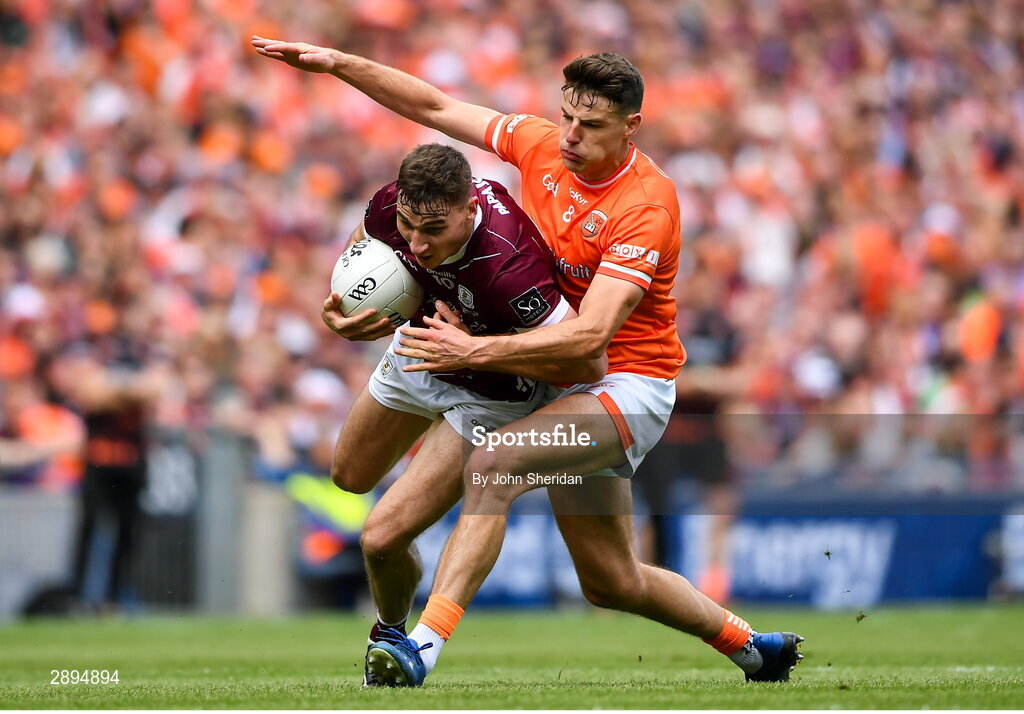 28 July 2024; Matthew Tierney of Galway in action against Niall Grimley of Armagh during the GAA Football All-Ireland Senior Championship Final match between Armagh and Galway at Croke Park in Dublin. Photo by John Sheridan/Sportsfile