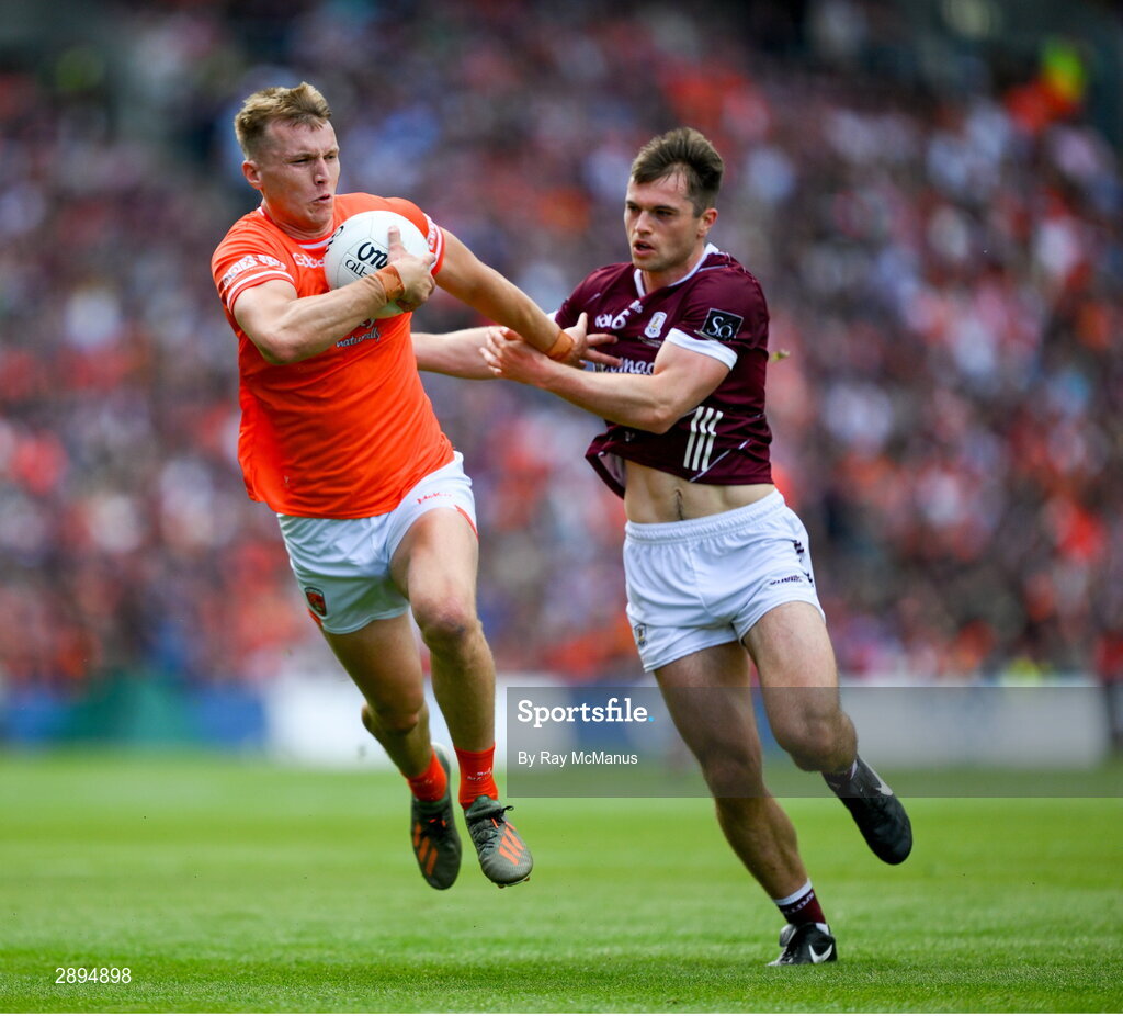 28 July 2024; Rian O'Neill of Armagh is tackled by Liam Silke of Galway during the GAA Football All-Ireland Senior Championship Final match between Armagh and Galway at Croke Park in Dublin. Photo by Ray McManus/Sportsfile