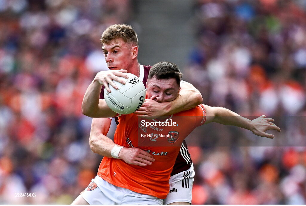 28 July 2024; Oisin Conaty of Armagh in action against Dylan McHugh of Galway during the GAA Football All-Ireland Senior Championship Final match between Armagh and Galway at Croke Park in Dublin. Photo by Harry Murphy/Sportsfile