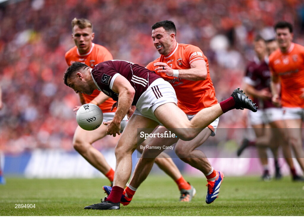 28 July 2024; Damien Comer of Galway in action against Aidan Forker of Armagh during the GAA Football All-Ireland Senior Championship Final match between Armagh and Galway at Croke Park in Dublin. Photo by Ramsey Cardy/Sportsfile