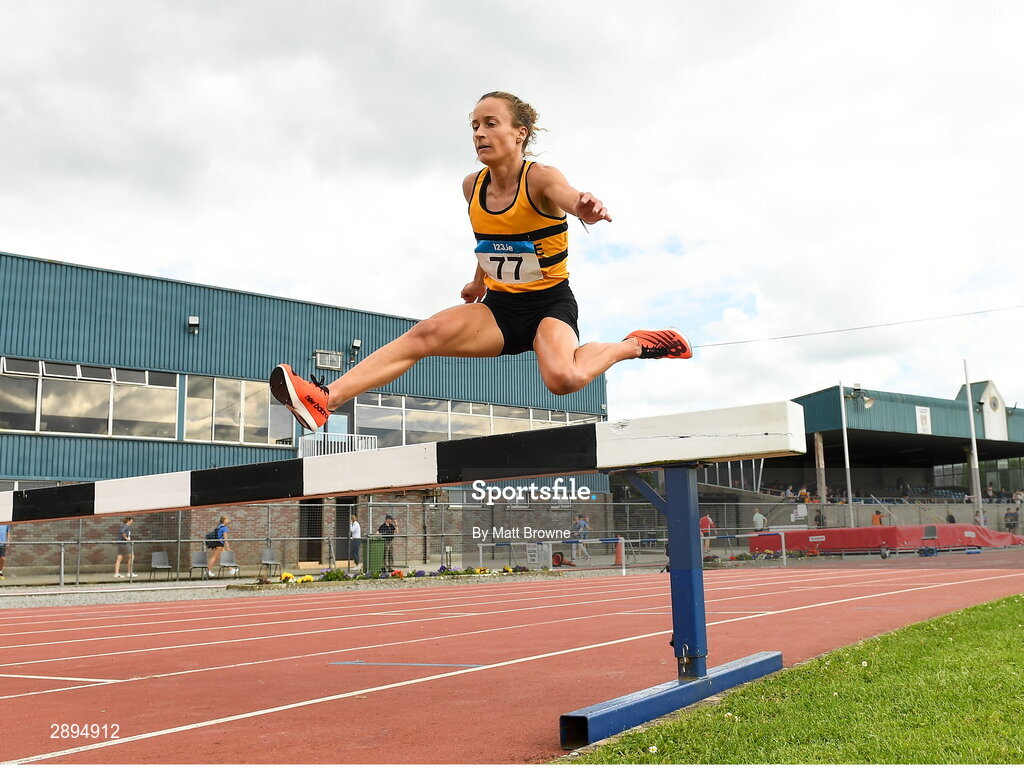 28 July 2024; Michelle Finn from Leevale AC on her way to winning the Premier Women 2000m S/C during the 123.ie National Track and Field League Final at Tullamore Harriers Athletics Club in Offaly. Photo by Matt Browne/Sportsfile