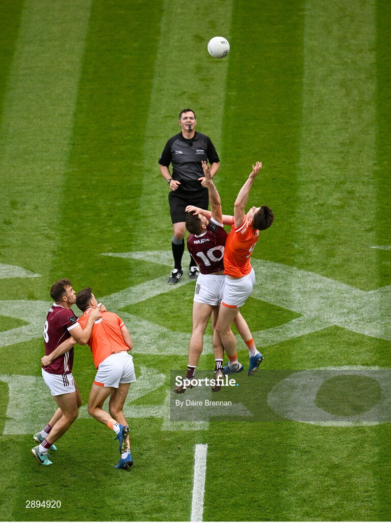 28 July 2024; Referee Sean Hurson throws in the ball between Paul Conroy, left, and Matthew Tierney of Galway and Niall Grimley, left, and Ben Crealey of Armagh to start the GAA Football All-Ireland Senior Championship Final match between Armagh and Galway at Croke Park in Dublin. Photo by Daire Brennan/Sportsfile