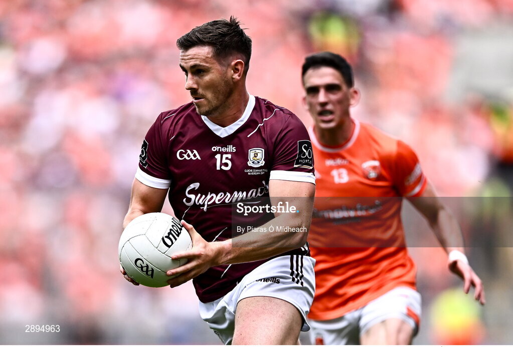 28 July 2024; Shane Walsh of Galway in action against Rory Grugan of Armagh during the GAA Football All-Ireland Senior Championship Final match between Armagh and Galway at Croke Park in Dublin. Photo by Piaras Ó Mídheach/Sportsfile