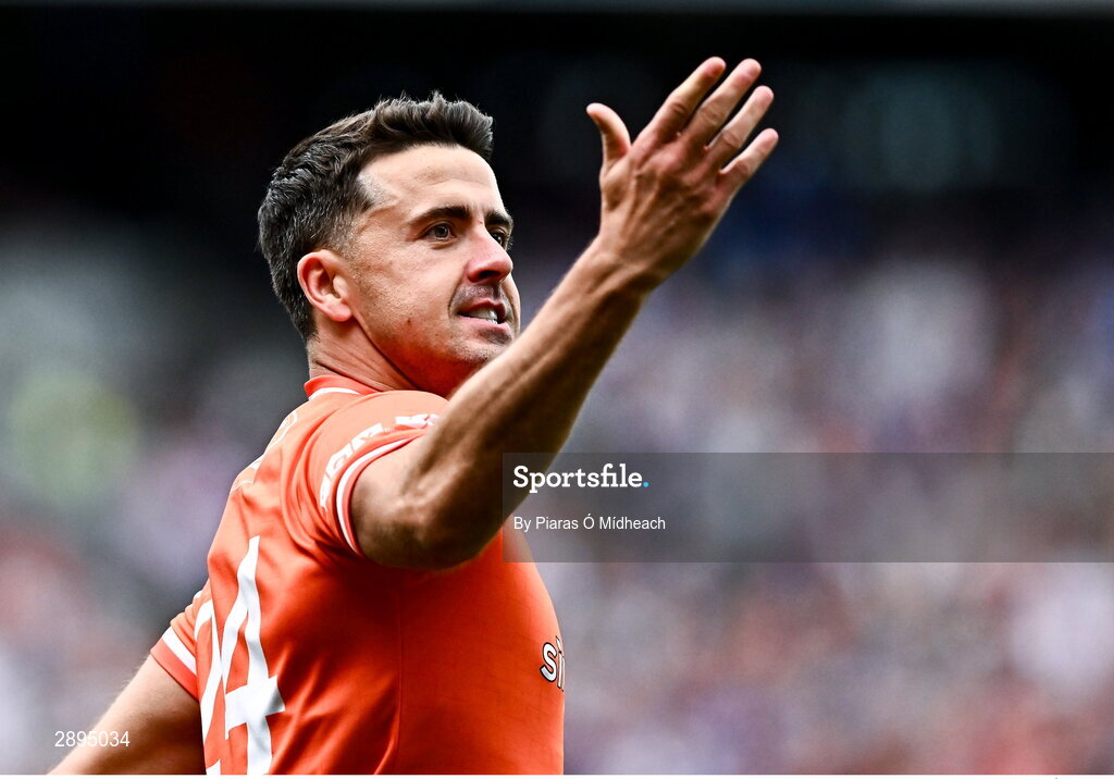 28 July 2024; Stefan Campbell of Armagh celebrates his side's first goal, scored by team-mate Aaron McKay, during the GAA Football All-Ireland Senior Championship Final match between Armagh and Galway at Croke Park in Dublin. Photo by Piaras Ó Mídheach/Sportsfile