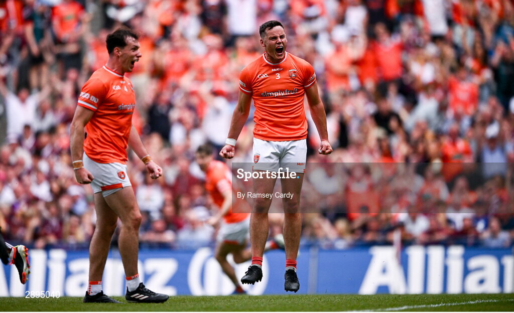 28 July 2024; Aaron McKay of Armagh celebrates after scoring his side's first goal during the GAA Football All-Ireland Senior Championship Final match between Armagh and Galway at Croke Park in Dublin. Photo by Ramsey Cardy/Sportsfile