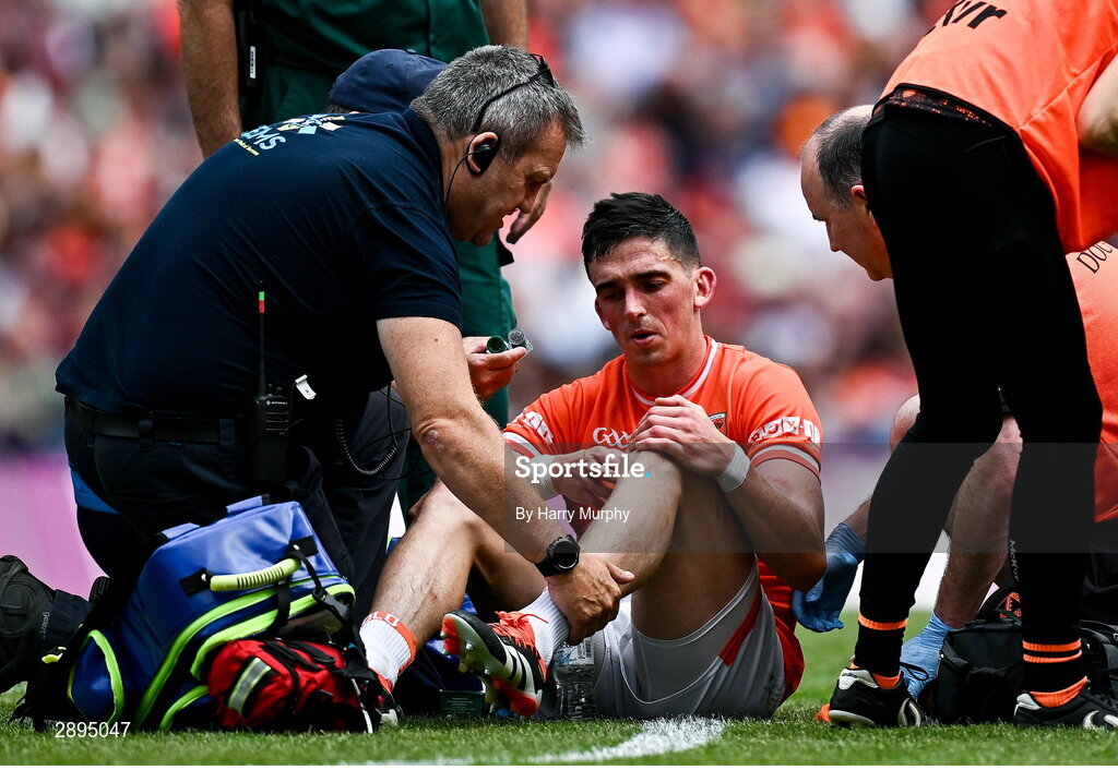 28 July 2024; Rory Grugan of Armagh receives attention before going off during the GAA Football All-Ireland Senior Championship Final match between Armagh and Galway at Croke Park in Dublin. Photo by Harry Murphy/Sportsfile