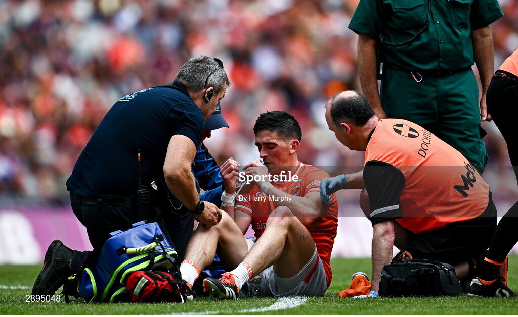 28 July 2024; Rory Grugan of Armagh receives attention before going off during the GAA Football All-Ireland Senior Championship Final match between Armagh and Galway at Croke Park in Dublin. Photo by Harry Murphy/Sportsfile