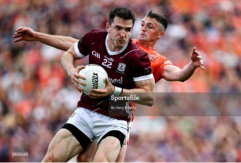 28 July 2024; Cein Darcy of Galway in action against Connaire Mackin of Armagh during the GAA Football All-Ireland Senior Championship Final match between Armagh and Galway at Croke Park in Dublin. Photo by Harry Murphy/Sportsfile