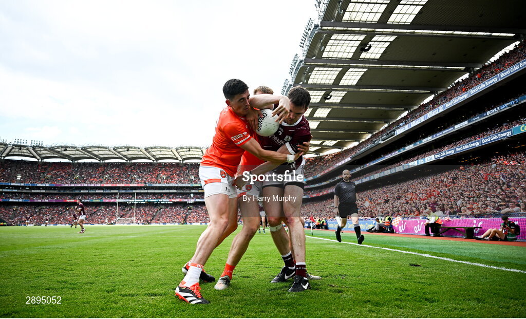 28 July 2024; Cein Darcy of Galway in action against Rory Grugan of Armagh during the GAA Football All-Ireland Senior Championship Final match between Armagh and Galway at Croke Park in Dublin. Photo by Harry Murphy/Sportsfile