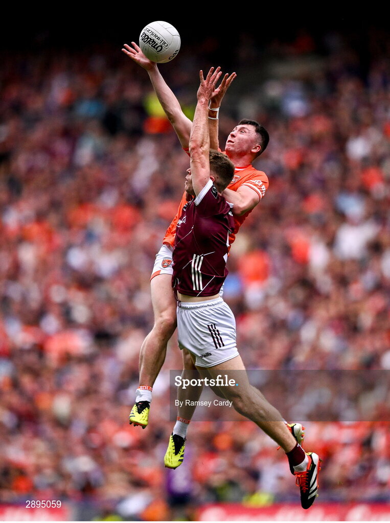 28 July 2024; Oisin Conaty of Armagh in action against Dylan McHugh of Galway during the GAA Football All-Ireland Senior Championship Final match between Armagh and Galway at Croke Park in Dublin. Photo by Ramsey Cardy/Sportsfile