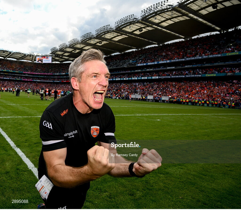 28 July 2024; Armagh manager Kieran McGeeney celebrates after their side's victory in the GAA Football All-Ireland Senior Championship Final match between Armagh and Galway at Croke Park in Dublin. Photo by Ramsey Cardy/Sportsfile