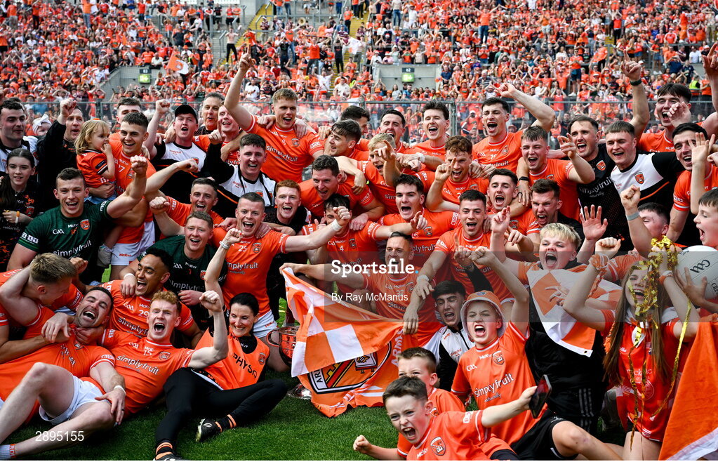 28 July 2024; The Armagh players celebrate with the Sam Maguire Cup, in front of their supporters on Hill 16, after the GAA Football All-Ireland Senior Championship Final match between Armagh and Galway at Croke Park in Dublin. Photo by Ray McManus/Sportsfile