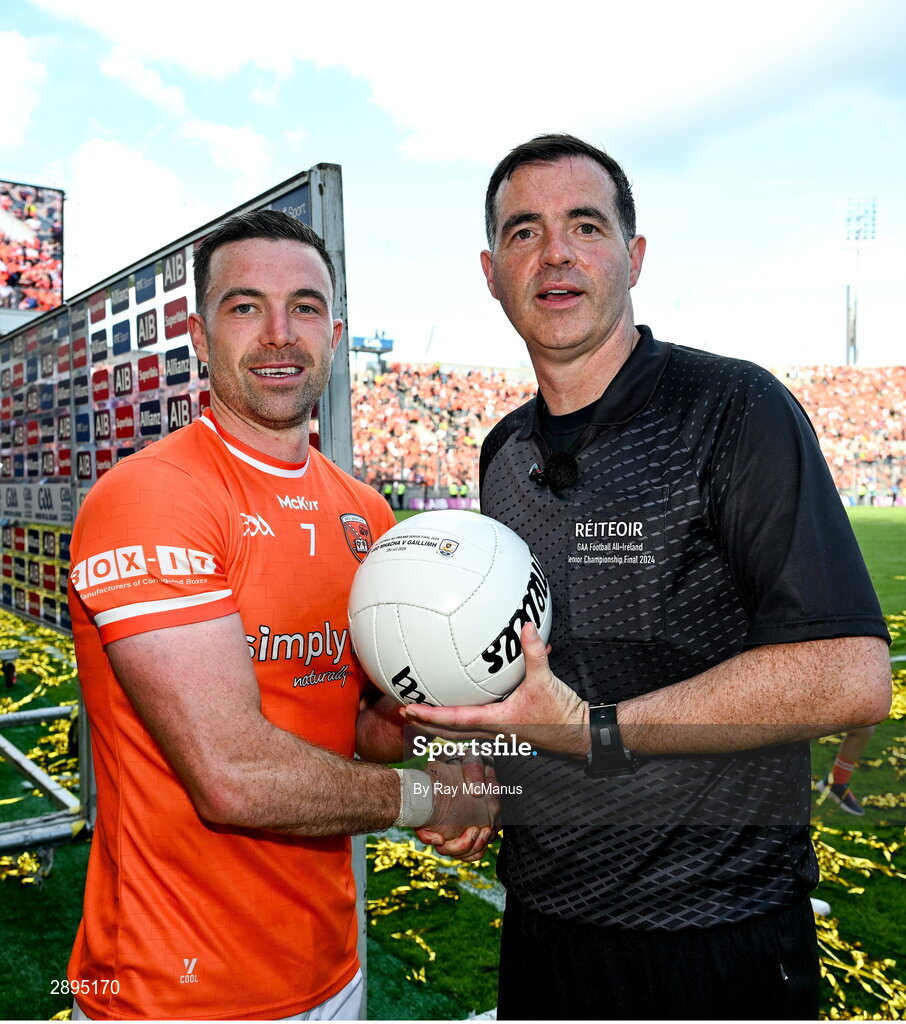 28 July 2024; Referee Sean Hurson presents the match ball to the Armagh captain Aidan Forker after the GAA Football All-Ireland Senior Championship Final match between Armagh and Galway at Croke Park in Dublin. Photo by Ray McManus/Sportsfile