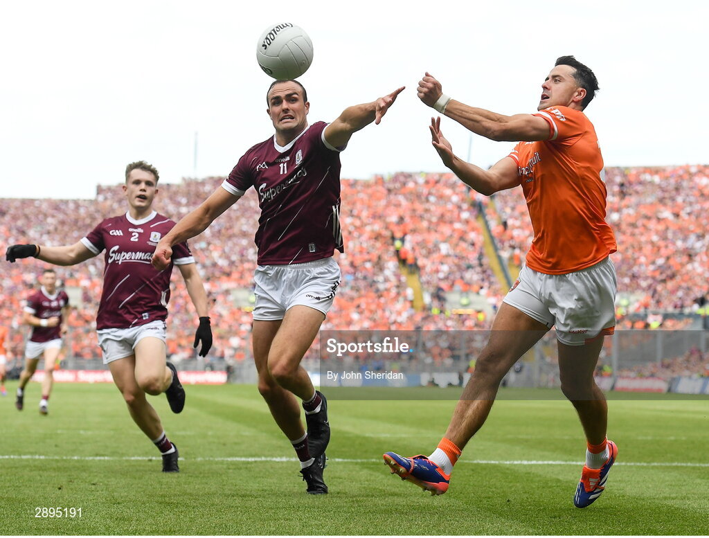28 July 2024; Stefan Campbell of Armagh in action against John Maher of Galway during the GAA Football All-Ireland Senior Championship Final match between Armagh and Galway at Croke Park in Dublin. Photo by John Sheridan/Sportsfile
