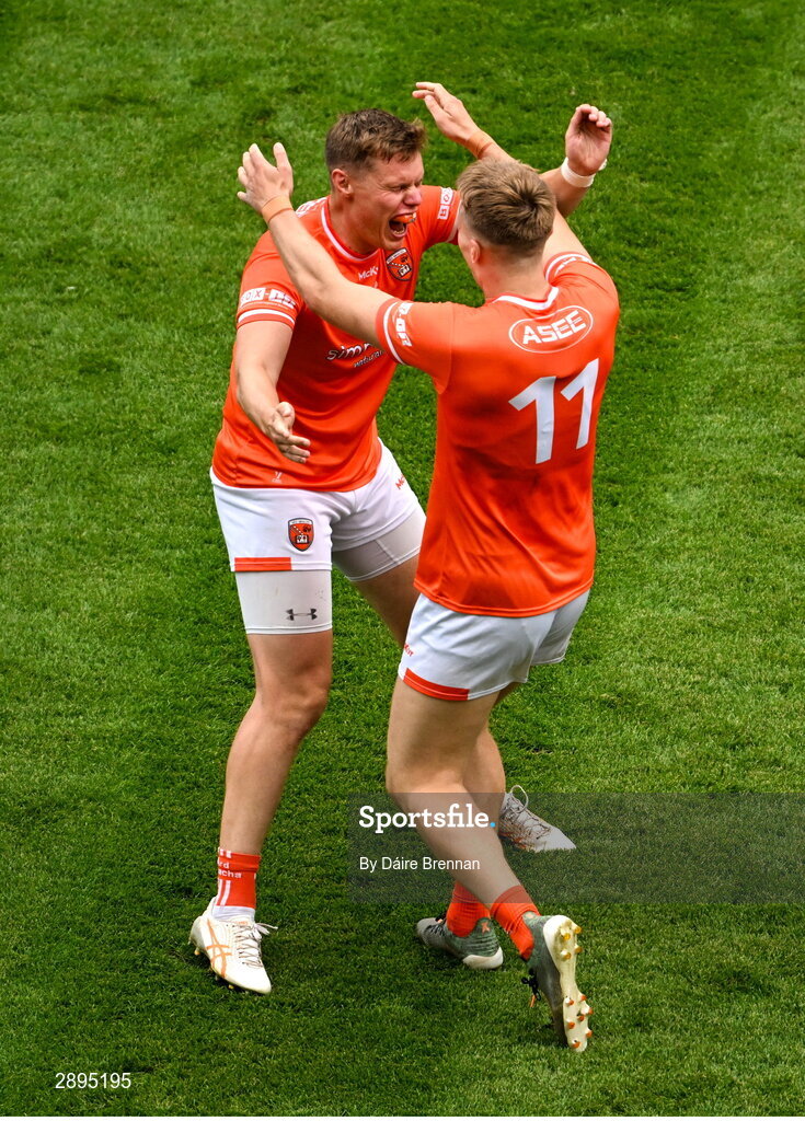 28 July 2024; Rian O'Neill of Armagh celebrates with his team-mate and brother Oisin O'Neill after the GAA Football All-Ireland Senior Championship Final match between Armagh and Galway at Croke Park in Dublin. Photo by Daire Brennan/Sportsfile