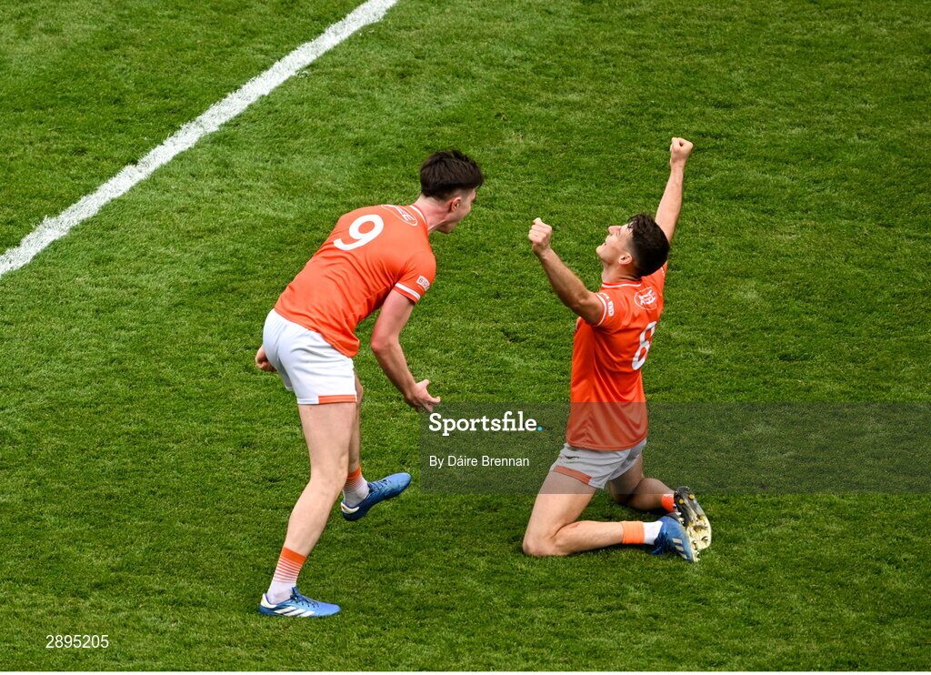 28 July 2024; Ben Crealey, left, and Tiernan Kelly of Armagh celebrate after the GAA Football All-Ireland Senior Championship Final match between Armagh and Galway at Croke Park in Dublin. Photo by Daire Brennan/Sportsfile