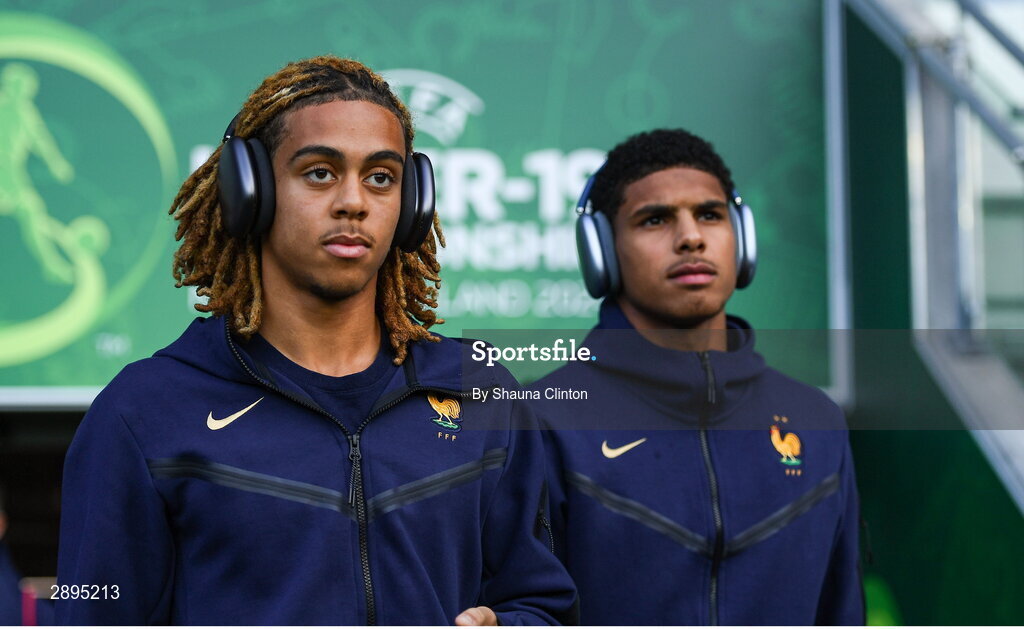 28 July 2024; Saimon Nadélia Bouabré, left, and Dehmaine Tabibou Assoumani of France arrive before the UEFA European U19 Championship finals match between Spain and France at the National Football Stadium at Windsor Park, Belfast. Photo by Shauna Clinton/Sportsfile