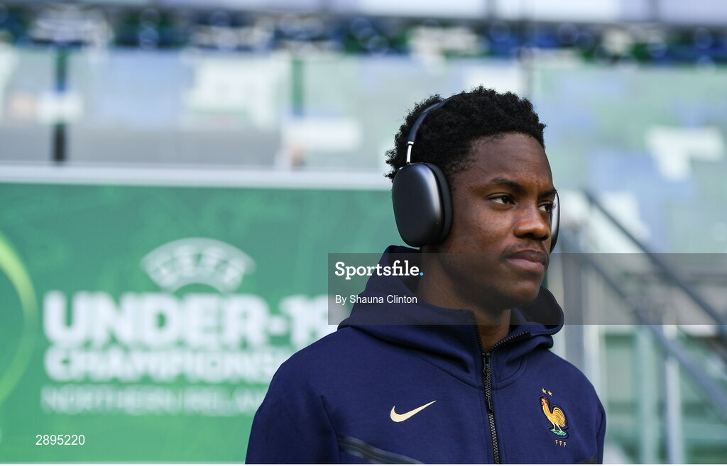 28 July 2024; Lucas Michal of France arrives before the UEFA European U19 Championship finals match between Spain and France at the National Football Stadium at Windsor Park, Belfast. Photo by Shauna Clinton/Sportsfile