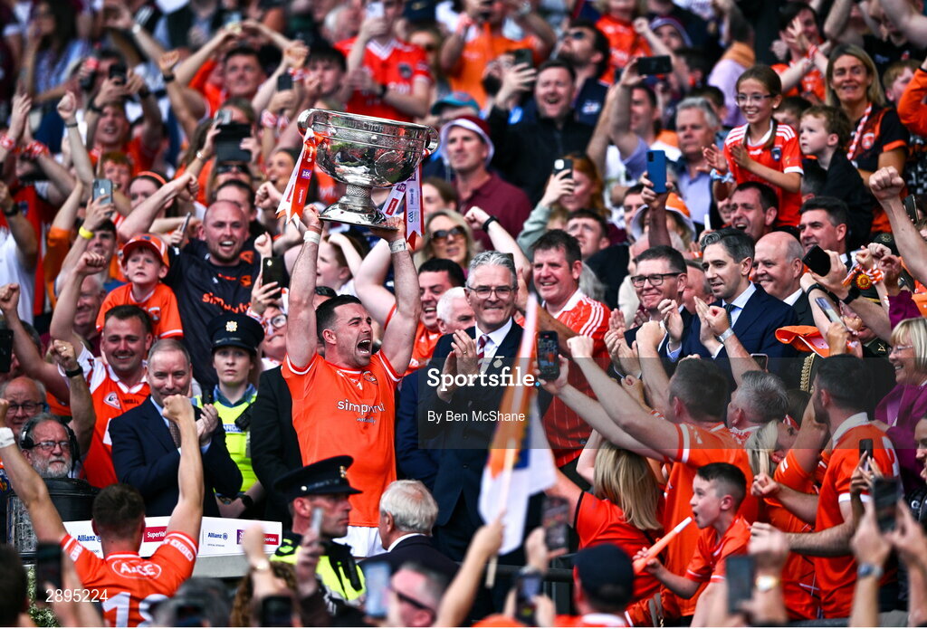 28 July 2024; Armagh captain Aidan Forker lifts the Sam Maguire Cup after the GAA Football All-Ireland Senior Championship Final match between Armagh and Galway at Croke Park in Dublin. Photo by Ben McShane/Sportsfile
