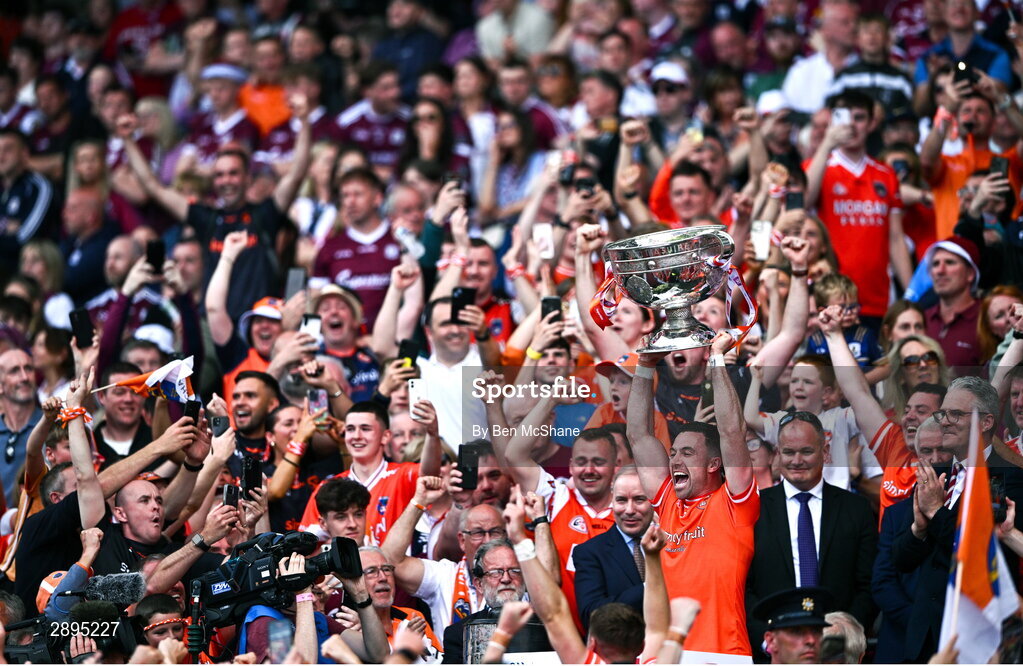 28 July 2024; Armagh captain Aidan Forker lifts the Sam Maguire Cup after the GAA Football All-Ireland Senior Championship Final match between Armagh and Galway at Croke Park in Dublin. Photo by Ben McShane/Sportsfile