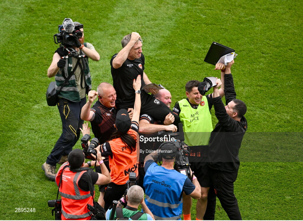 28 July 2024; Armagh manager Kieran McGeeney is lifted in celebration after the GAA Football All-Ireland Senior Championship Final match between Armagh and Galway at Croke Park in Dublin. Photo by Daire Brennan/Sportsfile