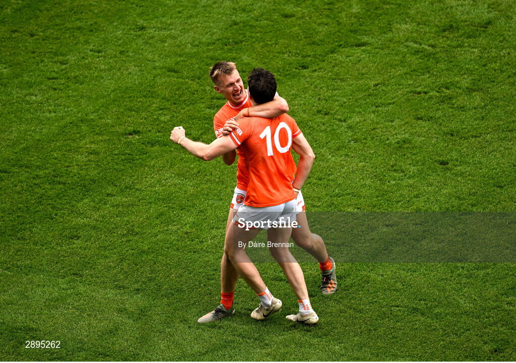 28 July 2024; Rian O'Neill, left, and Joe McElroy of Armagh celebrate after the GAA Football All-Ireland Senior Championship Final match between Armagh and Galway at Croke Park in Dublin. Photo by Daire Brennan/Sportsfile