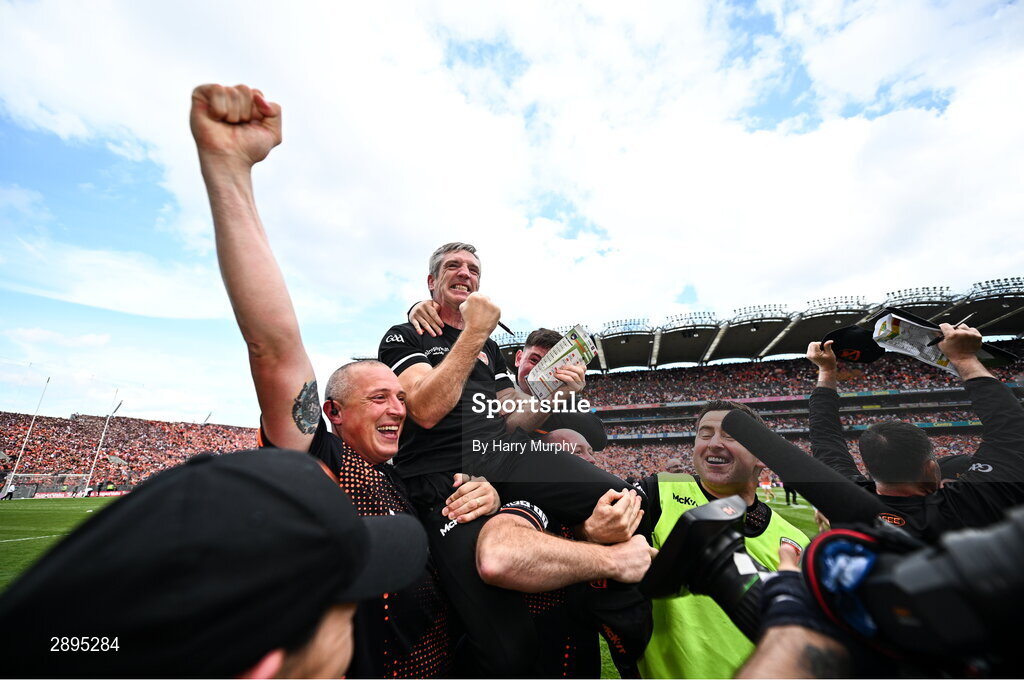 28 July 2024; Armagh manager Kieran McGeeney is lifted by his selectors Kieran Donaghy, Ciarán McKeever and Conleth Gilligan after their side's victory in the GAA Football All-Ireland Senior Championship Final match between Armagh and Galway at Croke Park in Dublin. Photo by Harry Murphy/Sportsfile