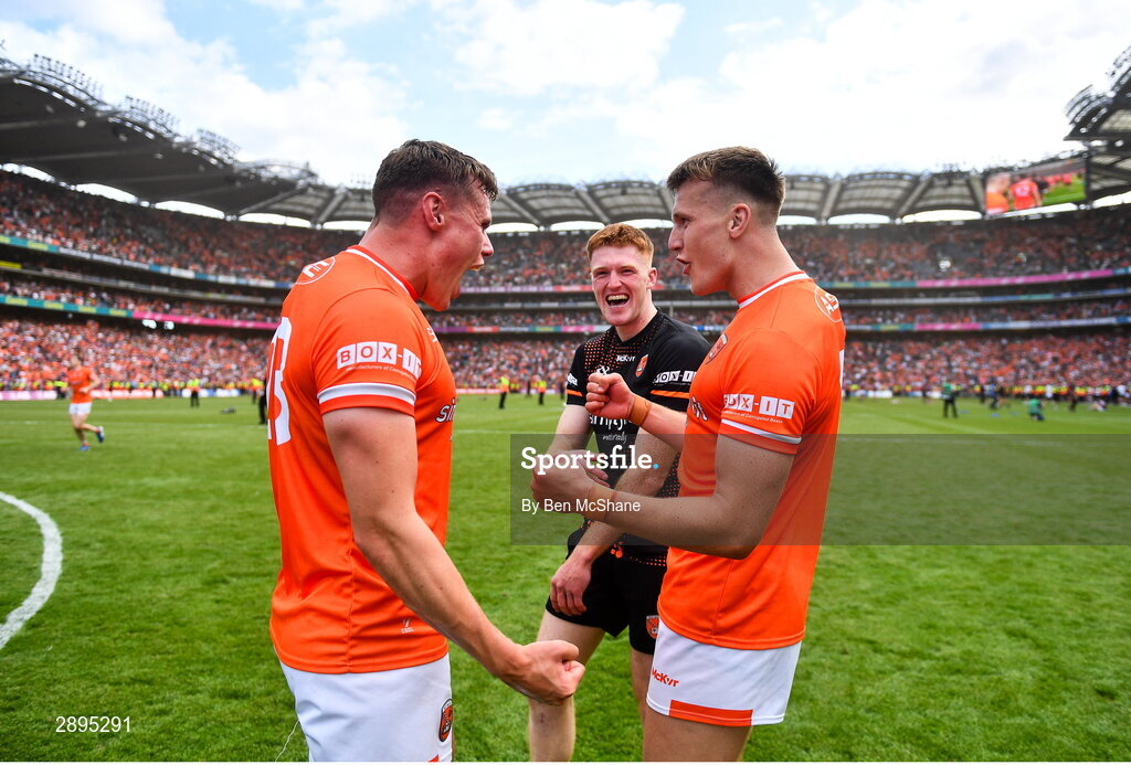 28 July 2024; Rian O'Neill, right, celebrates with his brother and Armagh teammate Oisin O'Neill after the GAA Football All-Ireland Senior Championship Final match between Armagh and Galway at Croke Park in Dublin. Photo by Ben McShane/Sportsfile