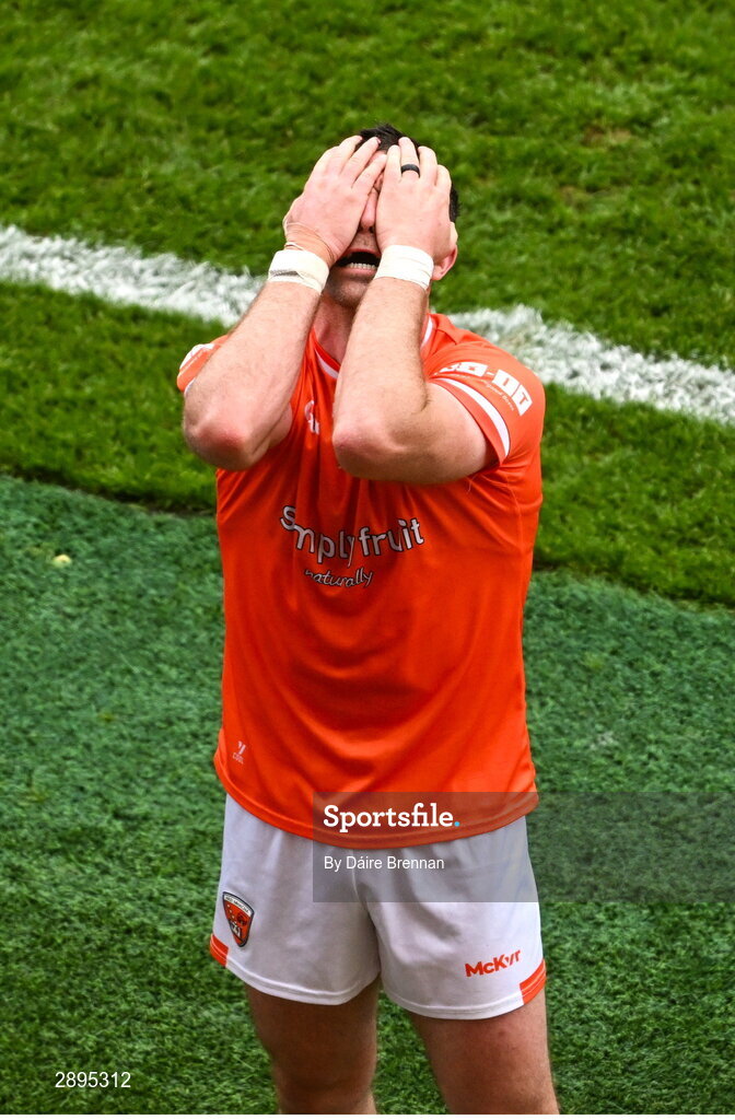 28 July 2024; Armagh captain Aidan Forker before going up the steps of the Hogan Stand to accept the Sam Maguire cup after the GAA Football All-Ireland Senior Championship Final match between Armagh and Galway at Croke Park in Dublin. Photo by Daire Brennan/Sportsfile