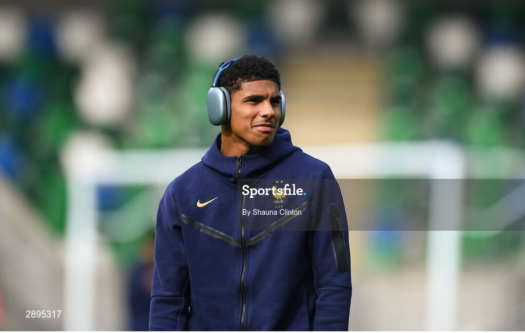 28 July 2024; Dehmaine Tabibou Assoumani of France inspects the pitch before the UEFA European U19 Championship finals match between Spain and France at the National Football Stadium at Windsor Park, Belfast. Photo by Shauna Clinton/Sportsfile