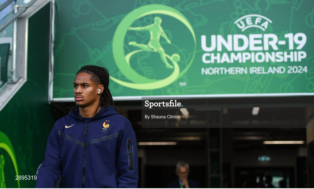 28 July 2024; Mathis Amougou of France arrives before the UEFA European U19 Championship finals match between Spain and France at the National Football Stadium at Windsor Park, Belfast. Photo by Shauna Clinton/Sportsfile