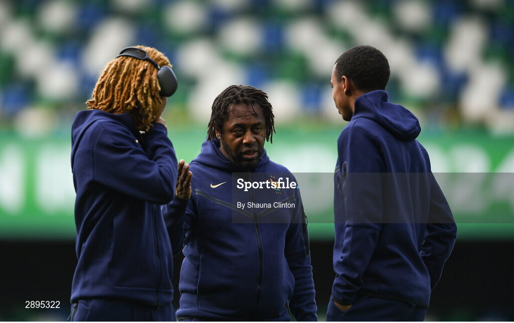28 July 2024; France manager Bernard Diomede, centre, speaks with players before the UEFA European U19 Championship finals match between Spain and France at the National Football Stadium at Windsor Park, Belfast. Photo by Shauna Clinton/Sportsfile