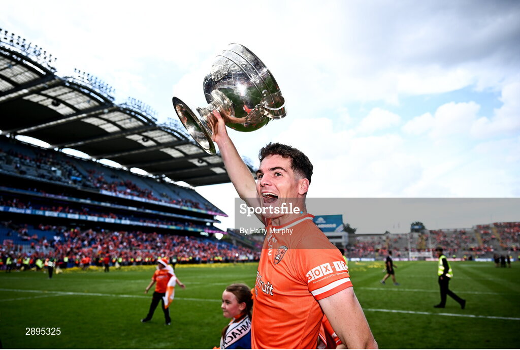 28 July 2024; Jarly Óg Burns of Armagh with the Sam Maguire Cup after his side's victory in the GAA Football All-Ireland Senior Championship Final match between Armagh and Galway at Croke Park in Dublin. Photo by Harry Murphy/Sportsfile