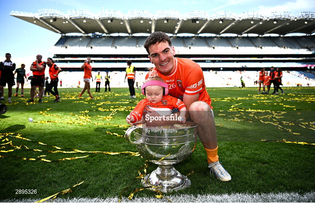 28 July 2024; Jarly Óg Burns of Armagh with his neice Bláithín in the Sam Maguire Cup after his side's victory in the GAA Football All-Ireland Senior Championship Final match between Armagh and Galway at Croke Park in Dublin. Photo by Harry Murphy/Sportsfile