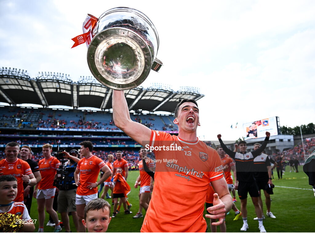 28 July 2024; Rory Grugan of Armagh with the Sam Maguire Cup the GAA Football All-Ireland Senior Championship Final match between Armagh and Galway at Croke Park in Dublin. Photo by Harry Murphy/Sportsfile