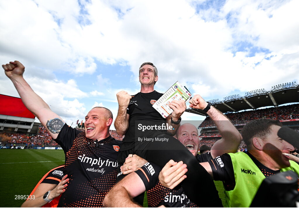 28 July 2024; Armagh manager Kieran McGeeney is lifted by his selectors Kieran Donaghy, Ciarán McKeever and Conleth Gilligan after their side's victory in the GAA Football All-Ireland Senior Championship Final match between Armagh and Galway at Croke Park in Dublin. Photo by Harry Murphy/Sportsfile