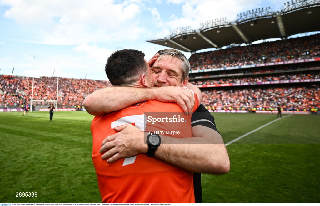 28 July 2024; Armagh manager Kieran McGeeney and Armagh captain Aidan Forker after their side's victory in the GAA Football All-Ireland Senior Championship Final match between Armagh and Galway at Croke Park in Dublin. Photo by Harry Murphy/Sportsfile