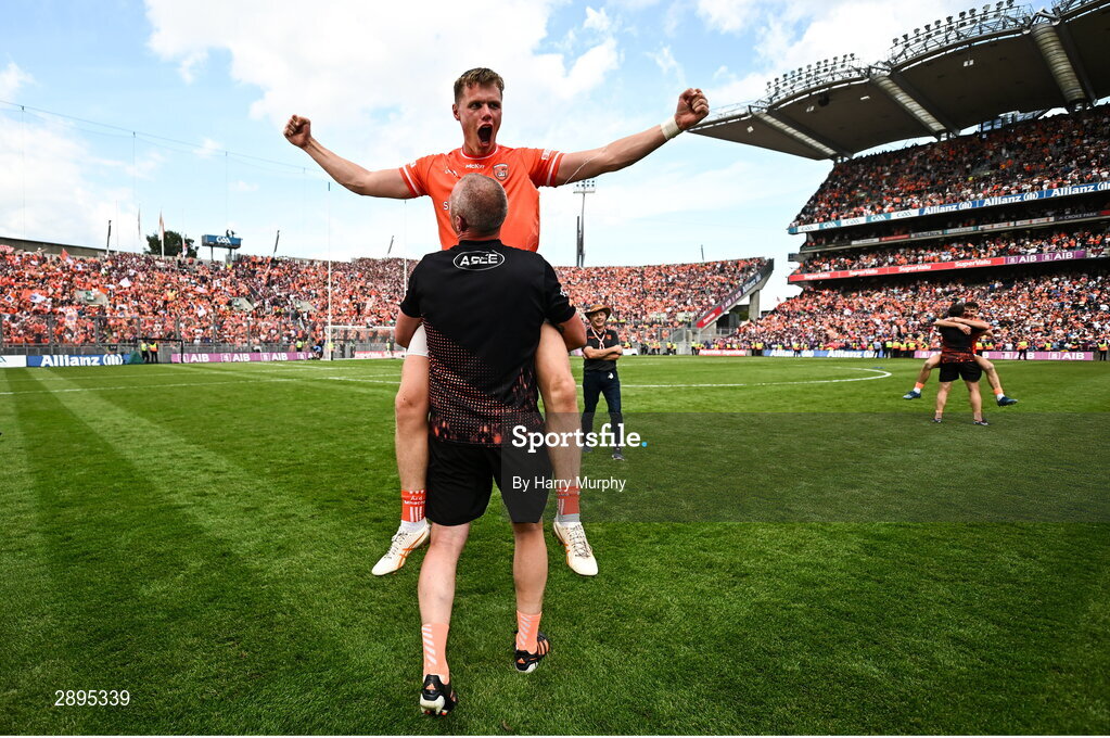 28 July 2024; Oisin O'Neill of Armagh is lifted by Armagh selector Kieran Donaghy after their side's victory in the GAA Football All-Ireland Senior Championship Final match between Armagh and Galway at Croke Park in Dublin. Photo by Harry Murphy/Sportsfile