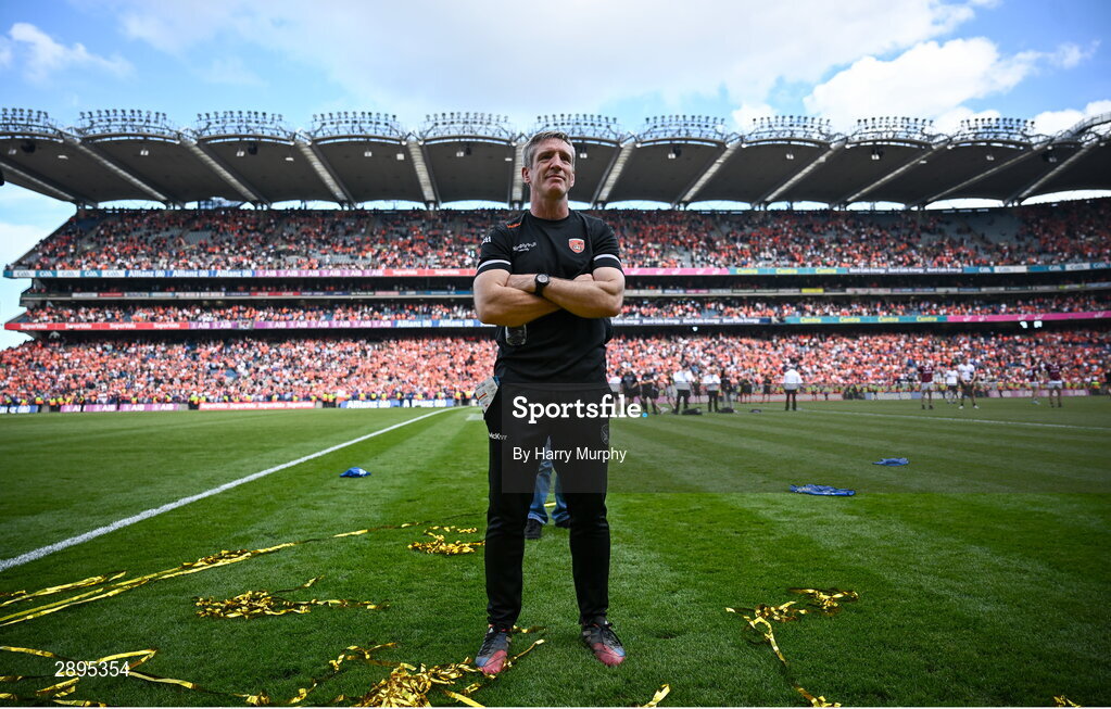 28 July 2024; Armagh manager Kieran McGeeney watches the trophy presentation after his side's victory in the GAA Football All-Ireland Senior Championship Final match between Armagh and Galway at Croke Park in Dublin. Photo by Harry Murphy/Sportsfile