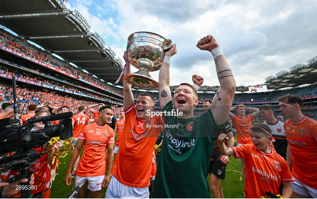 28 July 2024; Conor Turbitt, left, and Armagh goalkeeper Blaine Hughes with the Sam Maguire Cup after their side's victory in the GAA Football All-Ireland Senior Championship Final match between Armagh and Galway at Croke Park in Dublin. Photo by Harry Murphy/Sportsfile