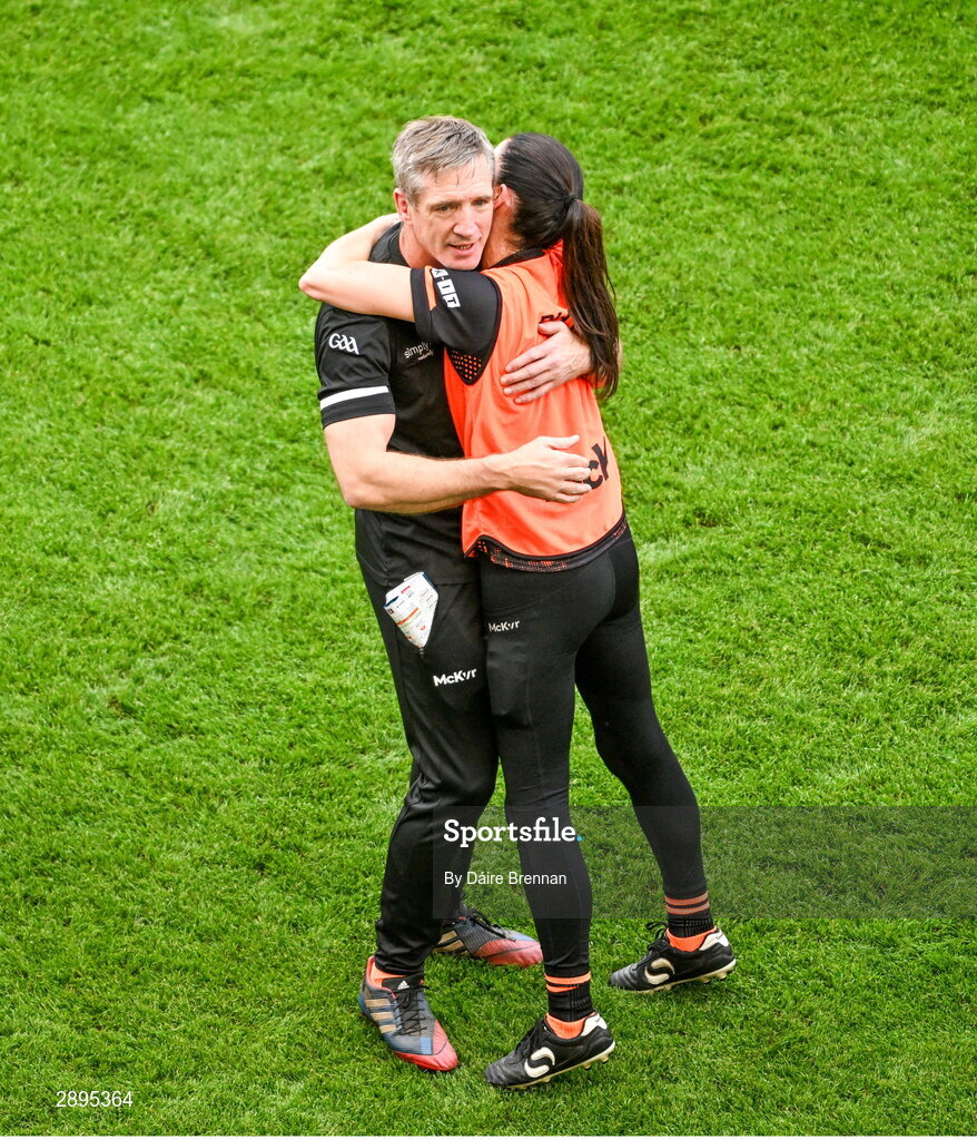 28 July 2024; Armagh manager Kieran McGeeney celebrates with his wife and team physio Maura after the GAA Football All-Ireland Senior Championship Final match between Armagh and Galway at Croke Park in Dublin. Photo by Daire Brennan/Sportsfile