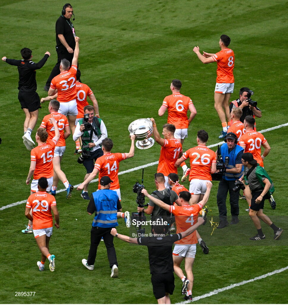 28 July 2024; Armagh players Rian O'Neill, right, and Andrew Murnin bring the Sam Maguire cup to their supporters on hill 16 after the GAA Football All-Ireland Senior Championship Final match between Armagh and Galway at Croke Park in Dublin. Photo by Daire Brennan/Sportsfile