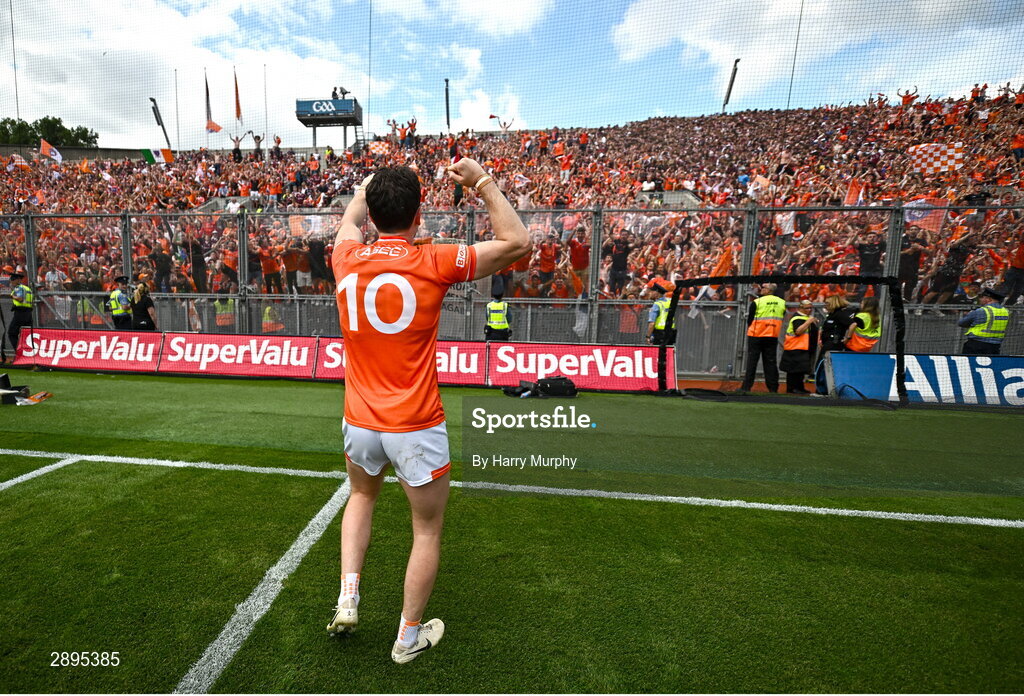 28 July 2024; Joe McElroy of Armagh celebrates in front of Hill 16 after his side's victory in the GAA Football All-Ireland Senior Championship Final match between Armagh and Galway at Croke Park in Dublin. Photo by Harry Murphy/Sportsfile