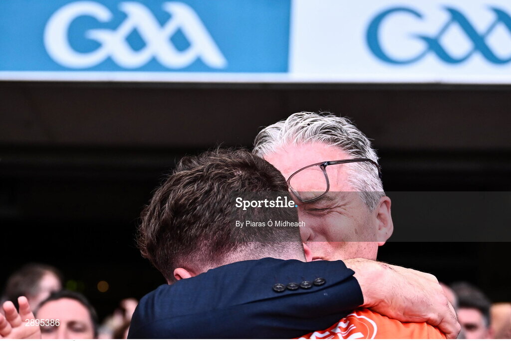 28 July 2024; Jarly Óg Burns of Armagh celebrates with his father, Uachtarán Chumann Lúthchleas Gael Jarlath Burns, after victory in the GAA Football All-Ireland Senior Championship Final match between Armagh and Galway at Croke Park in Dublin. Photo by Piaras Ó Mídheach/Sportsfile